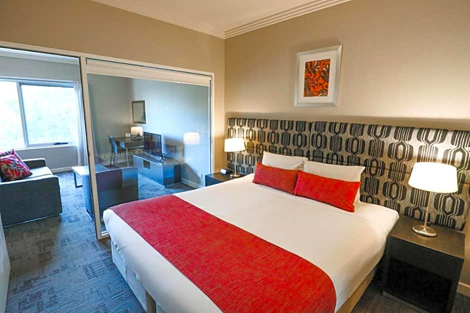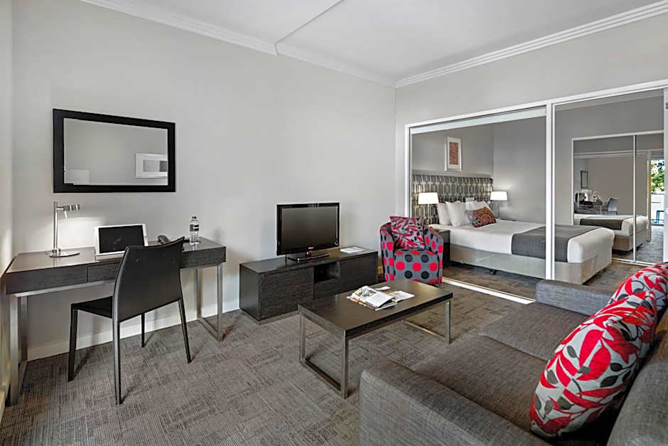 This apartment features a spacious balcony, a fully equipped kitchen, a separate bedroom with built-in wardrobes, a lounge room, a dining room, an in-room safe, a work desk, a personal laundry and a bathroom. It also has a Smart TV, broadband/Wi-Fi internet access, and reverse cycle air-conditioning.