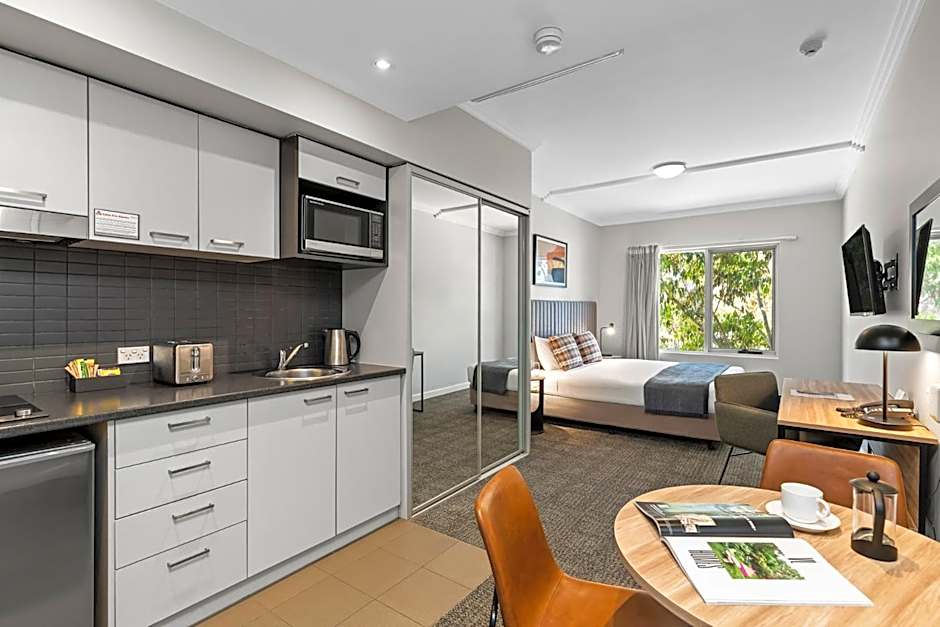 This open-plan studio room features a kitchenette, reverse cycle air conditioning, broadband internet access, a work desk, Smart TV . It also has a dining area and complimentary access to the on-site guest laundry.
